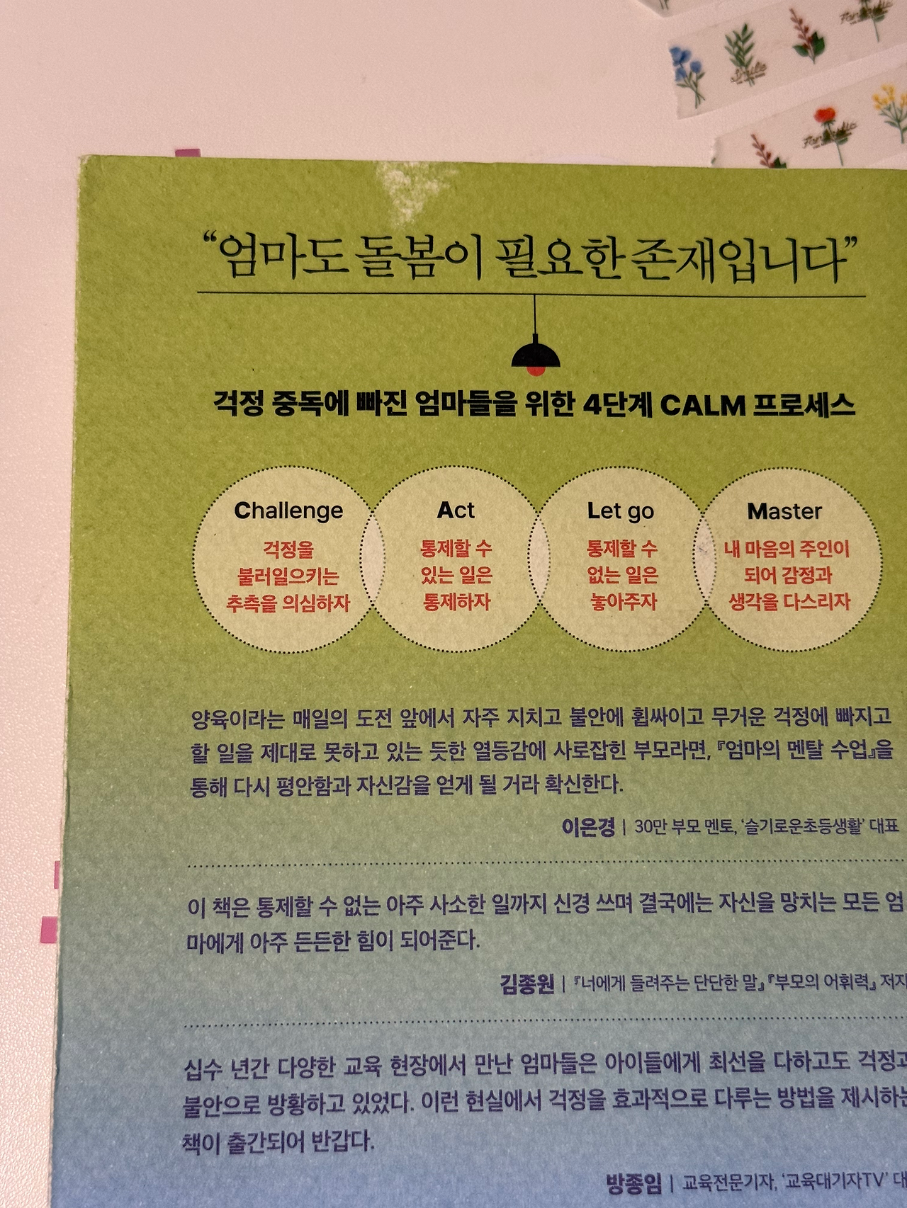 이 책의 소제목은 '아이에 대한 불안과 걱정을 이겨내는 4단계 멘탈 관리 공식'인데, 아이 대신에 어떤 걱정거리를 넣어도 해결이 가능해 보인다. 실제로는 '불안과 걱정을 이겨내는 4단계 멘탈 관리 공식'인 셈이다. 자기 계발 책이나 심리책이기도 하다. 육아(育兒)는 사실 육아(育我)라더니 맞는 말 같다. 아이를 통해 나를 키울 수 있는 기회가 있어서 참 감사하다.