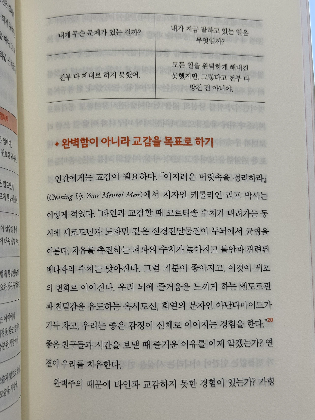 191쪽. 자기 자신을 위해 타인을 용서하기. 용서한다고 해서 잘못을 저지른 타인이 책임에서 자유로워지는 건 아니다. 용서는 당신이 느끼는 분노로부터 당신 자신을 해방한다. 당신이 지고 있는 정서적 고통에서 벗어나게 해 준다.