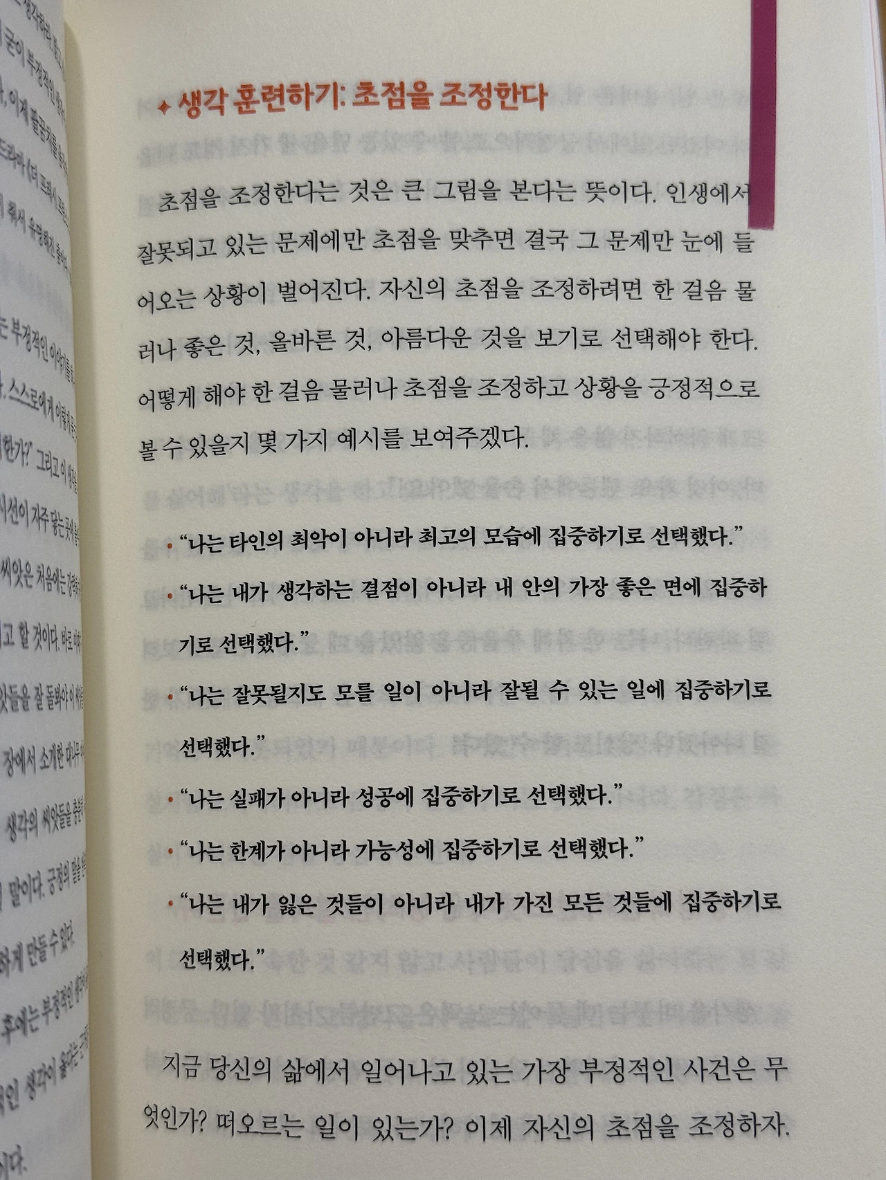 276쪽. 더 나은 결과를 얻고 싶다면 더 나은 생각을 해야 한다. 당신의 초점을 조정해야 한다. 인정과 관심, 사랑을 받는다고 느꼈던 때로 초점을 맞춘다. 자신이 생각하는 본인의 결점이 아니라 가치에 집중하라. 불안이라는 오래된 씨앗을 새롭고 건강한 진실로 대체하라.