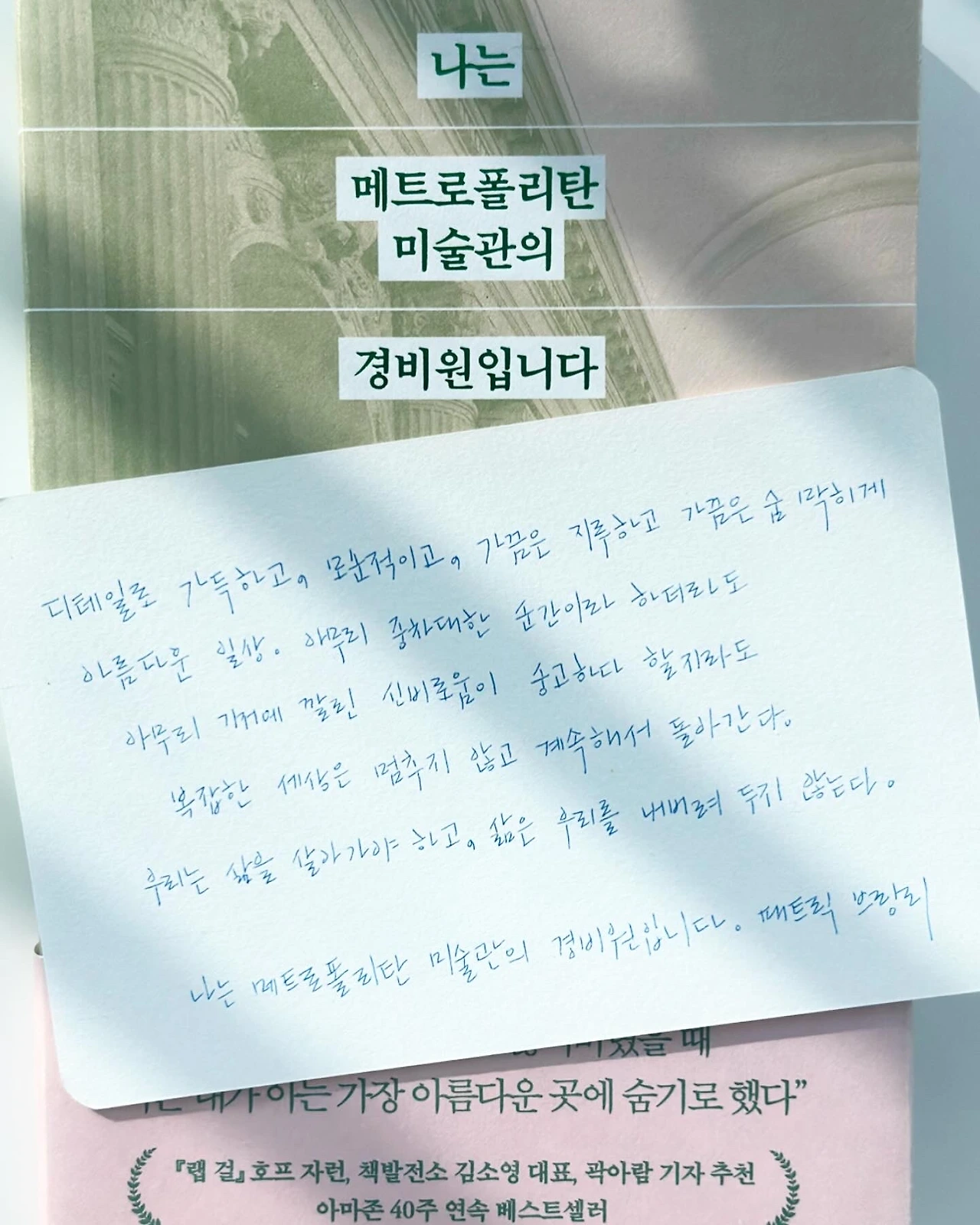 만약 인생에 배신당한 듯한 엄청난 슬픈 일을 겪고 세상 모든 일에 낙심하여 전도유망한 직업을 던져버리고 미술관 비정규직 경비로 취직했다면 어떻게 지냈을까. 무너진 나의 세상과는 동떨어져 잘만 굴러가는 세상을 한탄하고 한가로이 미술관에서 걸작을 구경하는 행복해 보이는 사람들을 시기하며 지내지 않았을까. 메트로폴리탄미술관 안에 수많은 경비원이 있었을 텐데 책을 써서 전 세계로 번역되는 베스트셀러를 쓴 사람은 브링리 뿐이었네. 태도와 관점의 문제일까. 어떤 상황에 있던지 나만의 길을 찾아가는 사람이 되고 싶다. 때로는 따뜻하게 가끔은 냉소적으로 바라보지만 그것들을 정리하고 표현할 수 있는 사람이 되고 싶다. 나의 경험이지만 그것을 나누고 공유해서 타인에게 세상의 지평을 넓혀주는 글을 쓰는 사람이 되고 싶다.