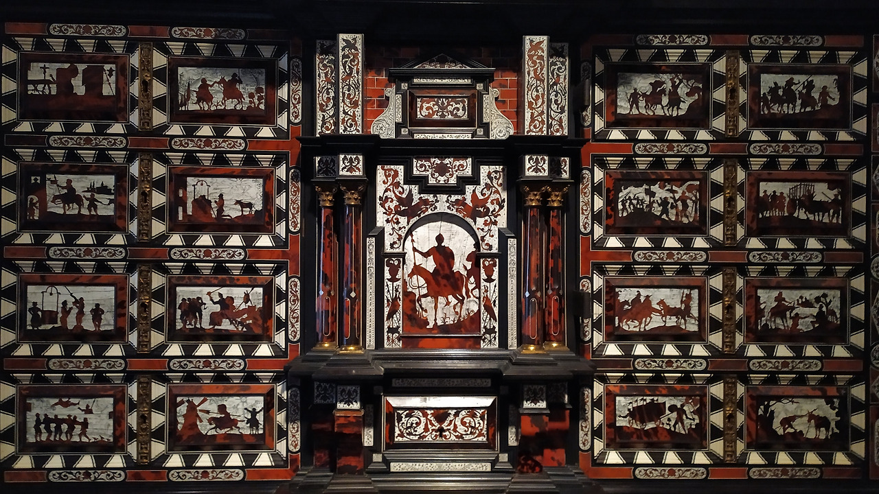 전시장실에 별도로 마련된 장식장이에요. 그 당시에 있던 것은 아니고, 세르반테스의 돈키호테를 기념해서 만든 장인의 장식품이랍니다. 중앙에는 돈키호테를, 양쪽에는 작품의 장면을 한땀한땀 정성들여 세공했어요. 그리고 맞은편에는 붉은색 바탕에 흰색으로 서로 배색을 달리한 장식장이 하나 더 전시되어 있어요.