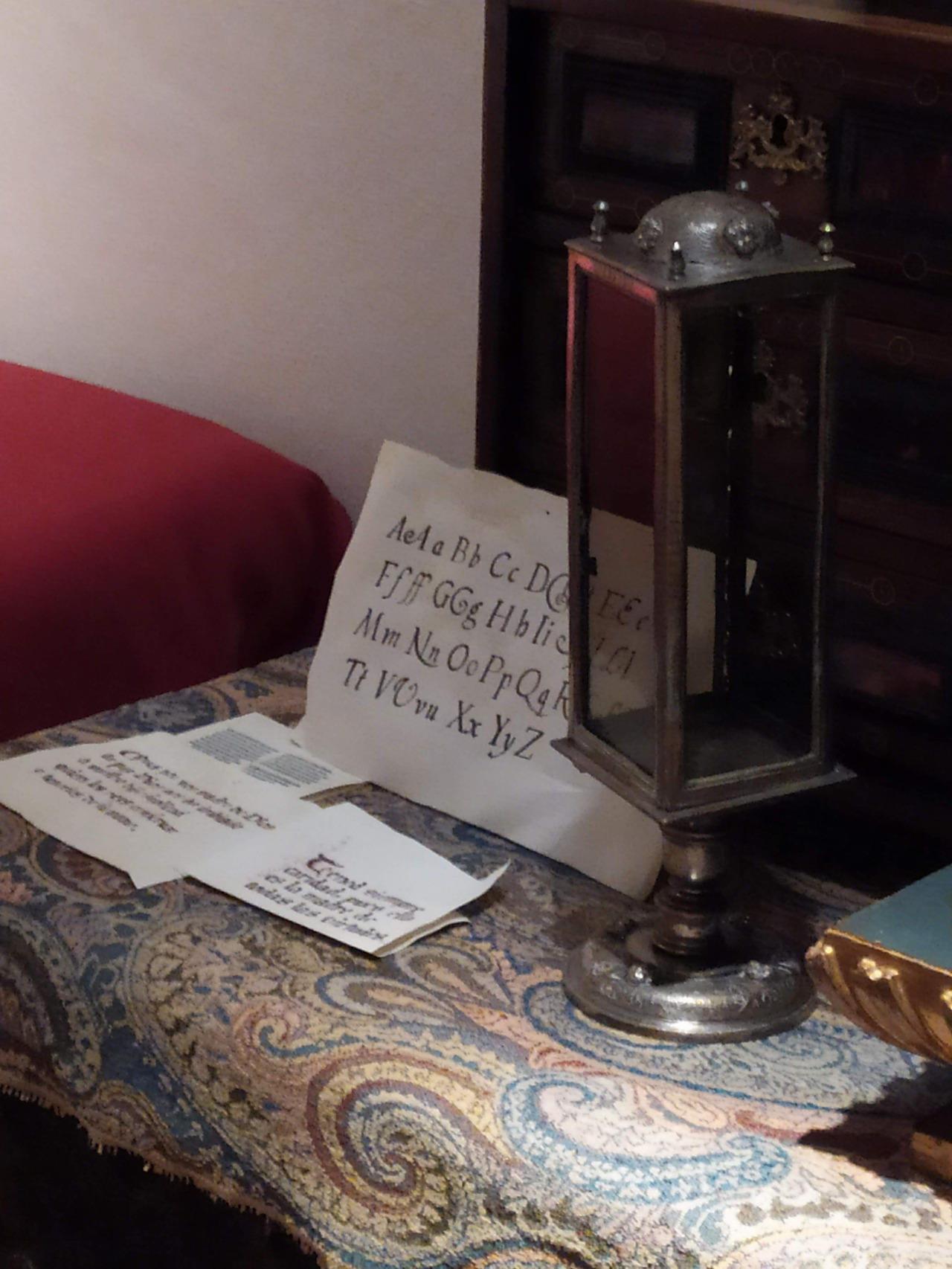세탁실 우측에 있는 하녀의 방이에요. 하루 종일 일을 보는 하녀들도 시에스타를 취해야 할 거 잖아요. 기본만 갖춰져 있는 침대가 있고, 그 앞에는 물레며 빨래통과 같은 가사에 필요한 도구들이 있어요. 그리고 역시 화로가 있답니다. 그리고 그분들도 글을 알아야 했죠. 정성스럽게 쓴 ABC 알파벳이에요. (K와 W는 당시 스페인어에는 없던글자라 없었답니다. 이건 나중에 스페인어 편에서 얘기해 드릴게요) 소박한 꿈 중에 하나가 깃털펜에 잉크 찍어 가면서 글 써보는 건데, 천방지축인 세 아이들 다 크기 전에 가능할지 모르겠네요.