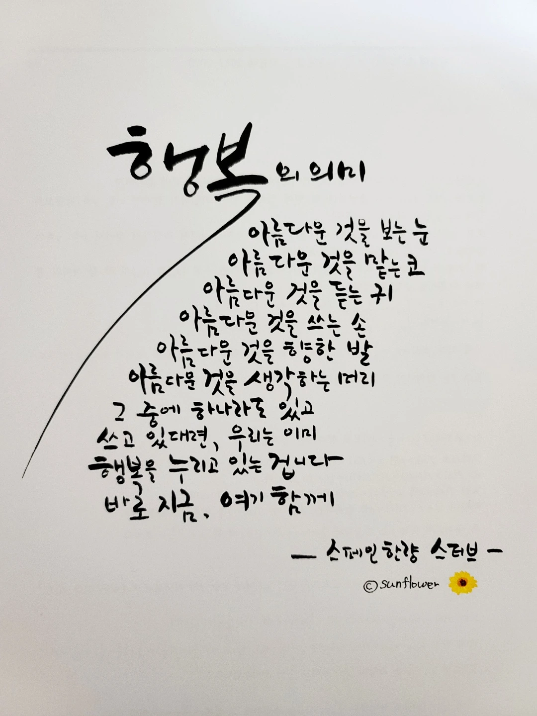 [ 행복의 의미 ]아름다운 것을 보는 눈아름다운 것은 맡는 코아름다운 것을 듣는 귀아름다운 것을 쓰는 손아름다운 것을 향한 발아름다운 것을 생각하는 머리그 중에 하나라도 있고쓰고 있다면, 우리는 이미행복을 누리고 있는 겁니다.바로. 지금. 여기. 함께.-스페인 한량 스티브