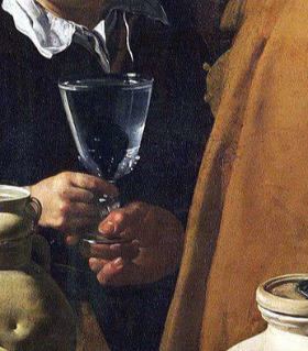 그럼에도 불구하고 이 그림들을 들여다보면 이들이 딱하다거나 불쌍하게 느껴지기보다는 놀라울 정도로 숙연한 감정이 인다. 벨라스케스의 따뜻한 시선일까, 천재적인 재능일까. 어떤 쪽이든 이들은 마치 성직자와 같은 결연한 표정과 곧은 자세로 생명을 이어 줄 음식과 물을 건네고 있다. 노파의 손에는 생명의 상징인 알이 쥐어져 있으며 노인이 받치고 있는 정갈하고 투명한 유리잔 안에도 씨앗을 품고 있을 과실이 한알 있다. 무화과이다. 레몬처럼 물 안에 넣어 향긋한 물 맛을 내는 데 사용했다고 한다.
