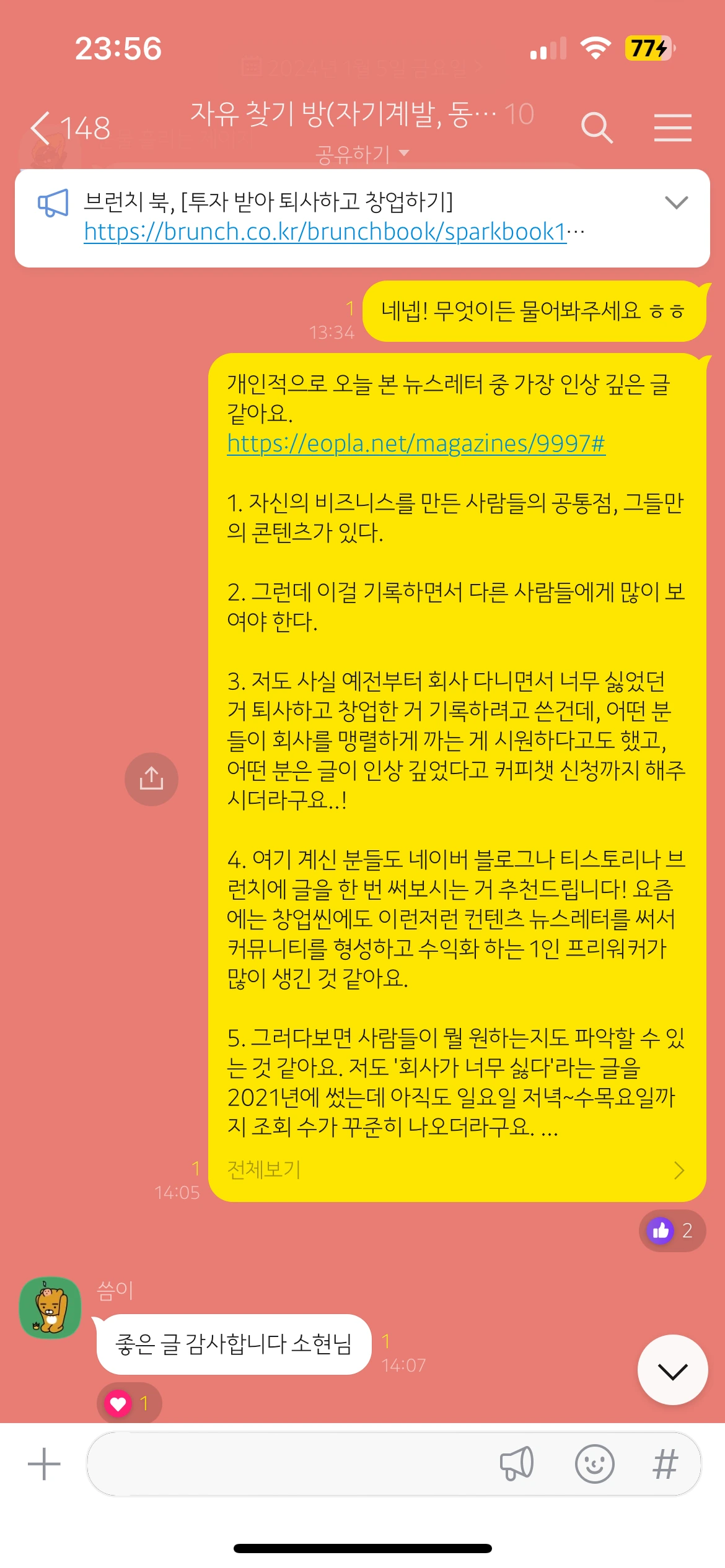 단톡방에 그냥 가만히 있기에는 죄송한 마음이 들었다. 나는 출근하면 온갖 정보 톡방을 확인하고 도움이 되는 뉴스레터를 정리하곤 하는데, 그럴 때마다 하나씩 공유해 드린다. 그리고 아주 가끔은 내 인사이트도 전해 드리긴 한다...ㅎㅎ 이 분들이 어떤 분들인지 잘 모르고, 퇴사에 꿈이 있는지, 창업을 하고 싶어 하시는지는 모르겠지만,