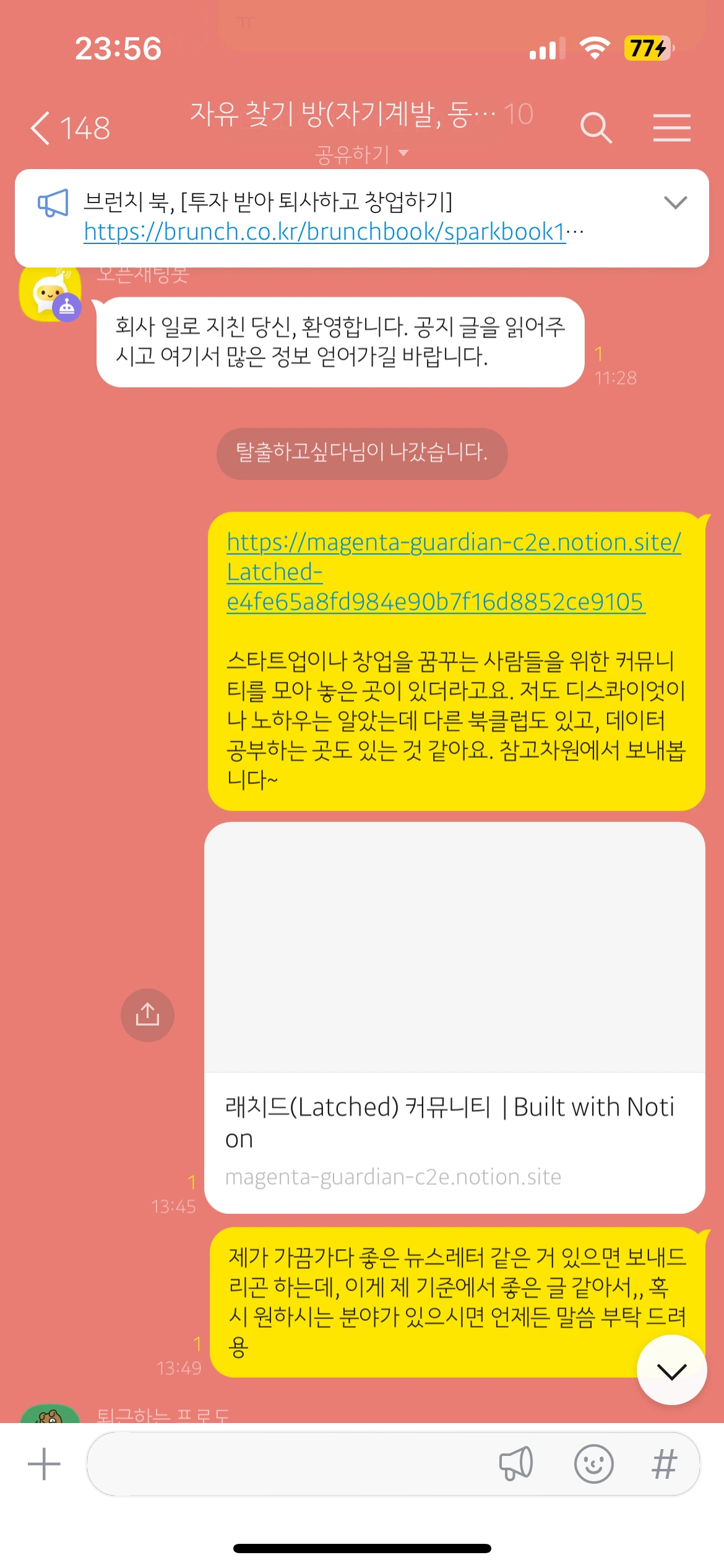 내 글 중에 회사가 정말 싫다는 글의 조회 수가 일요일~월요일 사이에 폭증을 한다. 회사를 정말 싫어하는 사람들이 많구나라는 것을 느꼈다. 그래서 같은 공간에 모여서 회사 욕도 하고 한탄도 해보시라고 오픈 카톡방을 열었다. 그런데 웬 걸. 아무도 안 들어올줄 알았는데,, 몇몇 분이 들어와 주셨다...ㅇㅅㅇ