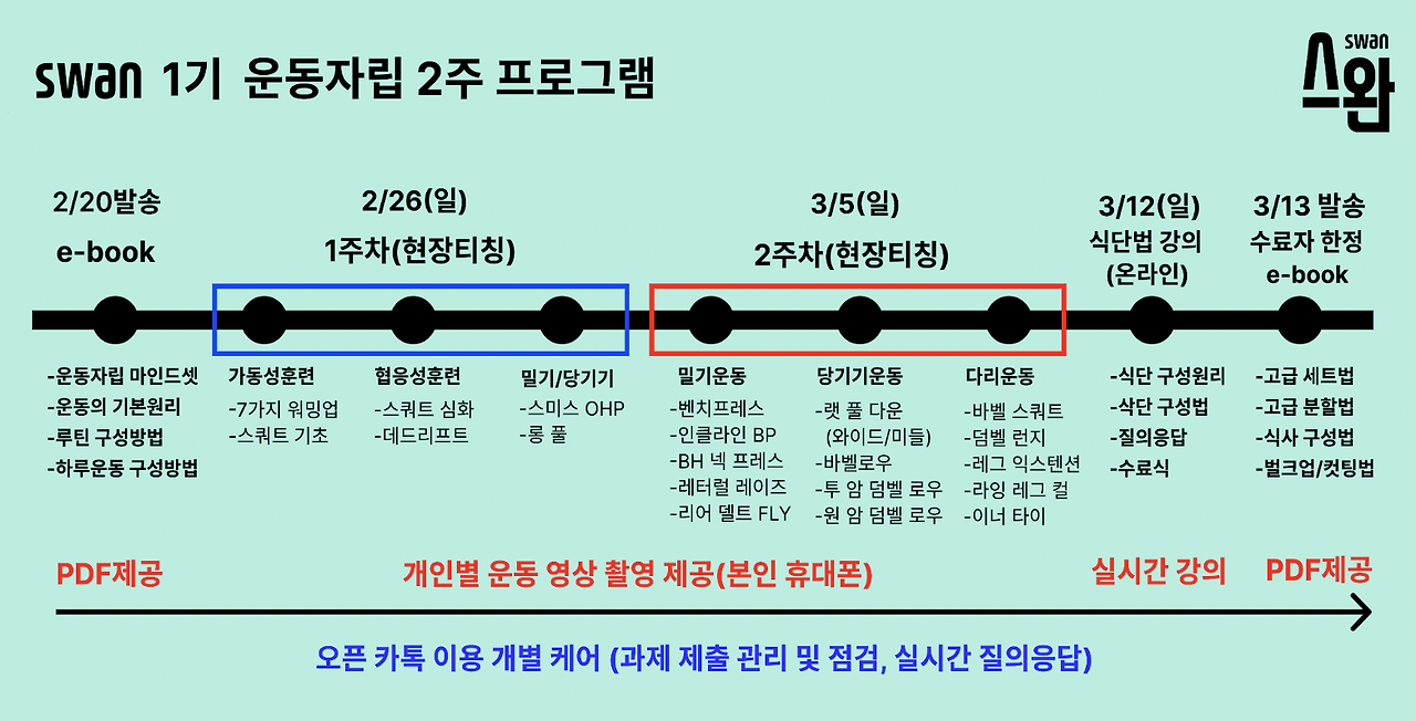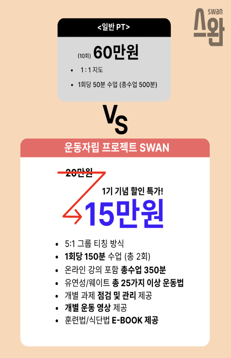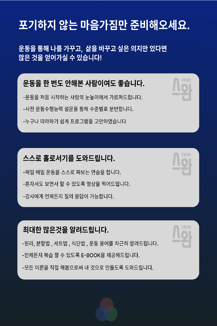 이런 문제를 해결하고자 짧은 시간 내에 운동법을 알려주는 프로그램을 기획했다. 그게 바로 스완('스스로 운동을 완료하다')이다.