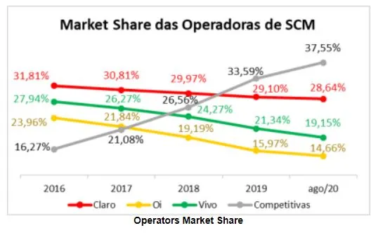 거기에 구매력이 부족한 개개인의 소규모 ISP가 Distributor를 통해 제품을 구매하게 되었고, 기존 Big3 통신사에 주로 제품을 공급하는 메이저 공급사(Sagemcom, Technicolor, Arris 등)의 비싼 제품이 아닌 Fiberhome, Huawei등 중국의 저가형 PON (Passive Optic Network) 제품이 대량으로 공급되며 시장의 점유율을 점차 끌어올린 것으로 보인다. 현재는 Acon Group, Vero, Wirelink같은 회사들을 중심으로 점차 인수합병이 이루어져 수십만단위의 가입자를 확보한 ISP도 생겨나고 있으며, 특히 기존 전체시장 점유율 2%로 4위에 랭크되어 있던 Algar Telecom의 경우 북동부 지역을 중심으로 가입자를 늘리고 있는 모양새를 띄고 있어 앞으로 시장이 어떻게 변화할지가 더욱 주목되고 있다.