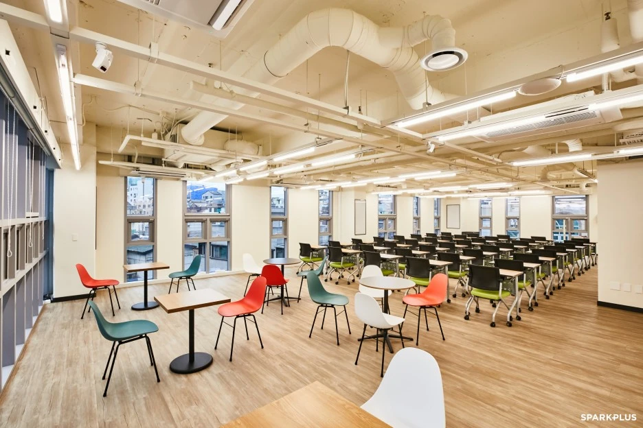 스파크플러스 전지점의 라운지 중 가장 큰 이벤트홀로 커뮤니티 데스크와 캔틴과 라운지를 함께 이용할 수 있는 허브홀입니다.네트워킹을 위한 특화된 공간으로 데모데이 개최나 청년 벤처나 창업을 위한 세미나, 교육 등이 이루어지는 공간입니다. 사무공간과는 독립된 계단식 이벤트 홀로 최대 80명까지 수용가능합니다.