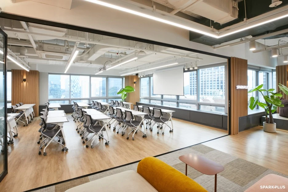 세미나룸은 지점마다 차이는 있지만 이벤트홀과 함께 또는 분리해서 사용할 수 있는데요. 폴딩도어를 이용해 독립적인 공간으로 이용 가능하며, 펼쳐서 이용할 경우에는 더 많은 인원을 수용하여 세미나, 밋업, 컨퍼런스 등 다양한 행사가 진행 가능합니다. 스파크플러스 멤버는 크레딧으로 이용 가능하며, 외부인의 경우 상담을 통해 대관이 가능합니다.