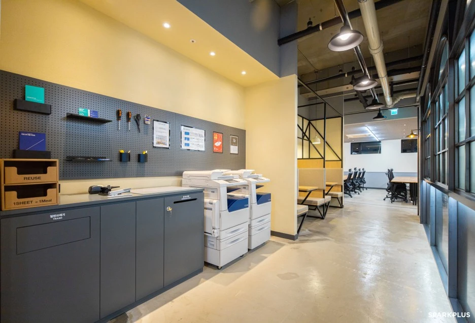 스마트워크 환경에서 클라우드에서 문서를 주고받기 때문에 종이 문서 사용률이 줄어 사무 용품을 개별적으로 가지고 있지 않아도 되는데요. 프린터와 간단한 사무용품이 오피스존에 마련되어 있어 필요시 간편하게 사용할 수 있어요.