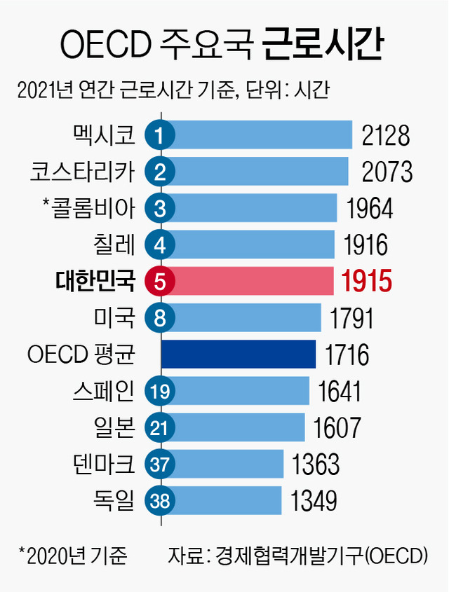 실제로 2020년 기준 OECD 통계에 따르면 한국 임금근로자의 근로시간은 근무환경이 비슷한 나라인 일본(1,607시간)과 미국(1,791시간) 보다 월등히 많은 한국(1,915시간)으로 나타났습니다. 주요국 중 가장 낮게 집계된 독일(1,349시간) 보다 무려 141%나 높은 수치인데요. 어찌 보면 회사는 제2의 집이라고 불러도 과장이 아닌 것처럼 느껴집니다.