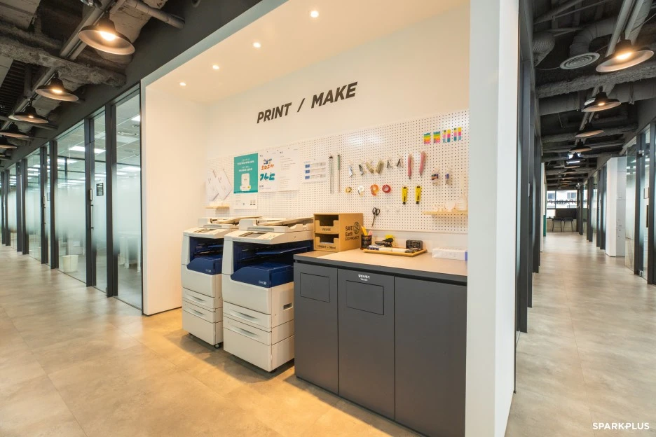 스파크플러스는복사기나 파쇄기, 사무용품이 놓아져 있는 곳은 복도 끝 쪽으로 공간을 구성하고, 통화는 프라이빗하게 할 수 있도록 '폰부스'를 설치해 사용자는 편안하게 통화할 수 있고 소음이 밖으로 새어 나오지 않아서 소음을 줄일 수 있습니다.