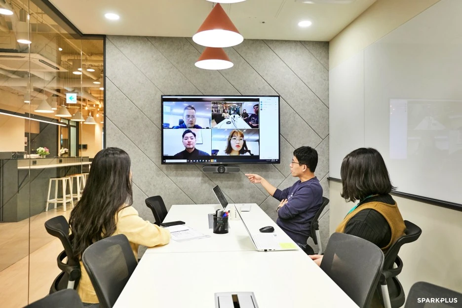 인원이 많다면 큰 테이블과 여러 개의 의자가 필요하며, 중요도 높은 회의를 할수록 빔프로젝터나 TV와 연결할 수 있는 시스템, 원격 회의가 가능한 컨퍼런스 캠 등 다양한 장비가 필요합니다.