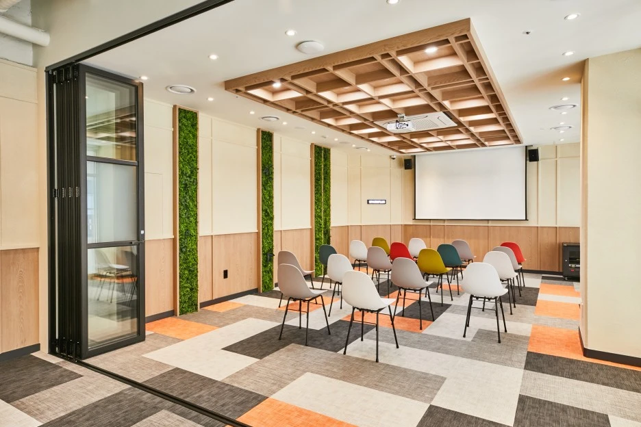 참여형 회의를 진행할 때 10인 이상 다양한 인원수로 진행되기 때문에 넓은 공간이 필요합니다. 폴딩도어가 있는 세미나 룸의 경우는 조금 더 프라이빗하게 진행할 수 있으며, 인원이 많은 참여형 세미나의 경우는 오픈해서 넓게 사용할 수 있도록 '폴딩도어'로 인원수를 조절하여 사용할 수 있게 하는 게 좋습니다.