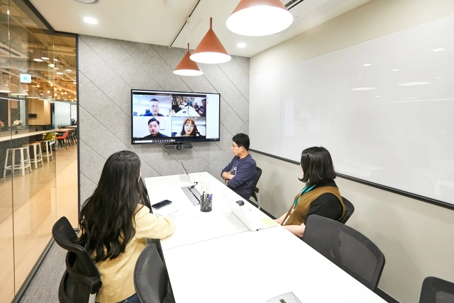 실제로 화상회의를 강남2호점에서 진행해 봤는데요. 여러 명의 담당자가 함께 앉은 자리에서 편하게 이야기하듯이 회의가 가능해 편리했습니다.