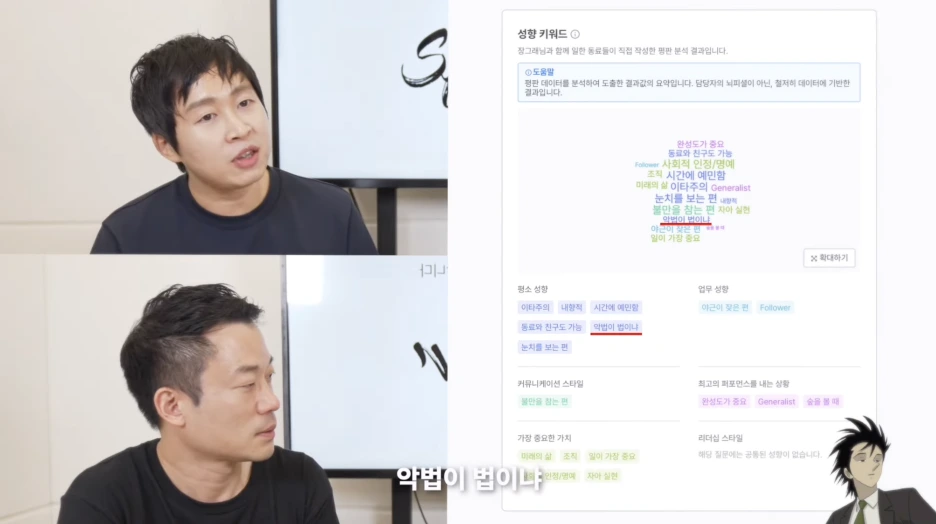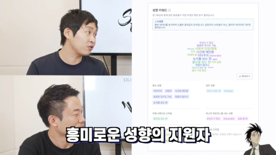 평소 성향은 말 그대로 지원자의 평소 성격이나 태도를 말해요. 여기서 ‘악법도 법이냐'라는 키워드가 공통적인 장그래의 성향으로 나타났어요. ‘악법도 법이냐'라는 키워드는 기존 질서에 문제의식을 갖고 있다고 해석할 수 있어요. 사회의 문제를 찾아 빠르게 해결하려는 스타트업에 비교적 잘 맞는 성향으로 볼 수 있죠. 하지만 이러한 성향이 너무 강하면 조직 내 질서를 무시할 수 있고, 고집이 강할 수 있어서 다른 성향 키워드도 신중히 평가해야 합니다.