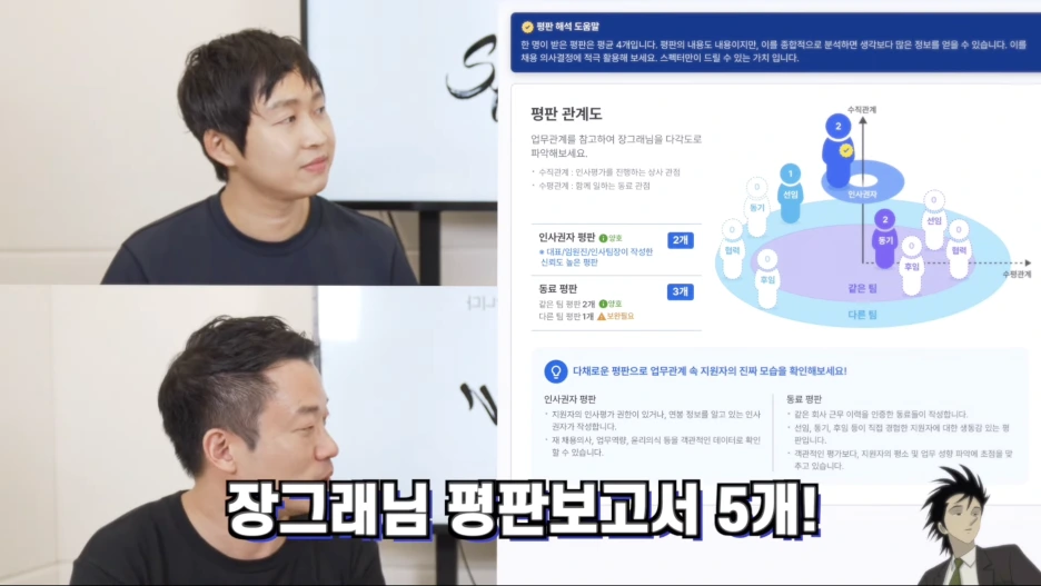 장그래는 스펙터 평판조회(레퍼런스 체크)를 이용하여 추천인들의 평판을 확보했습니다. 총 5명으로부터 평판을 받았는데요, 2명은 인사권자(대표, 임원, 인사팀장), 나머지 3명은 동료 평판(팀원, 선임, 다른 팀 직원 등)이었습니다.
