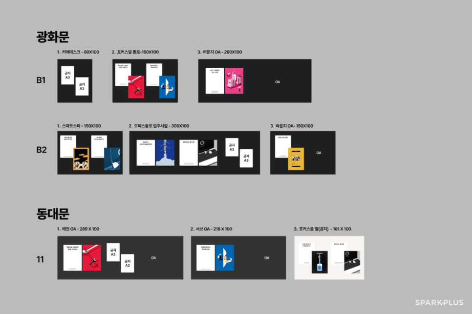 오피스운영Lab 주이) WoW 2.0을 하게 된다면, 기획 단계에서부터 스파크플러스 멤버들과 함께 하고 싶어요. 일부 지점을 대상으로 오프라인 팝업을 진행해서, 멤버들이 스스로 ‘WoW 2.0’을 만들어 보고 공모하는 방식 등으로요. 또 매체도 더 다양화해보고 싶습니다. 이번엔 총 3개의 매체(포스터, 시트, DID)를 활용했는데요, 다음엔 멤버들 각자의 책상에 디피할 수 있는 굿즈라든지, 온라인으로 공유할 수 있는 웹사이트라든지요. 단순한 오피스 공간을 넘어 일하는 문화까지 선도하는 스파크플러스가 되고자 합니다.