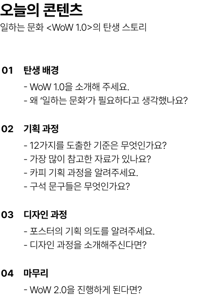 개인에게 라이프스타일이 있듯, 회사엔 워크스타일이 있습니다. 라이프스타일에서 그 사람의 배경, 가치관, 성격, 희망을 엿볼 수 있듯, 워크스타일도 마찬가지입니다. 여러분들의 회사엔 '일하는 방식' 또는 ‘일하는 문화’가 있나요? 자랑하고 싶은 문화가 있다면 댓글을 통해 공유 부탁드립니다. 만약 없다면 ‘스파크플러스’의 <WoW 1.0>을 참고해 만들어 보세요. 다음 편은 따뜻한 봄, 공유오피스에 찾아온 쾌적한 진심인 ‘클리닝’ 캠페인을 주제로 찾아뵙겠습니다.