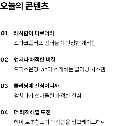 비단 식당뿐 아니라 사무실도 마찬가지입니다. 매일 아침 출근했을 때 마주할 오피스의 모습이 순간의 기분 그리고 하루의 생산성에까지 영향을 줄 수 있다고 생각합니다. 수많은 기업에게 업무공간을 제공하는 공유오피스 브랜드인 스파크플러스가 ‘사소하지만 긍정적인 고객 경험’에 집착하는 이유도 이 때문입니다. 깨끗하게 정돈된 공간은 물론 그 공간을 만드는 사람들의 에너지가 스파크플러스 멤버들에게 닿을 수 있도록, 4월은 ‘클리닝에 진심’ 캠페인을 진행했습니다. 오늘은 멤버들이 인정한 스파크플러스의 쾌적함, 이러한 쾌적함을 만들어온 비결, 더 쾌적한 업무환경을 만들기 위한 도전을 소개해 드리겠습니다.