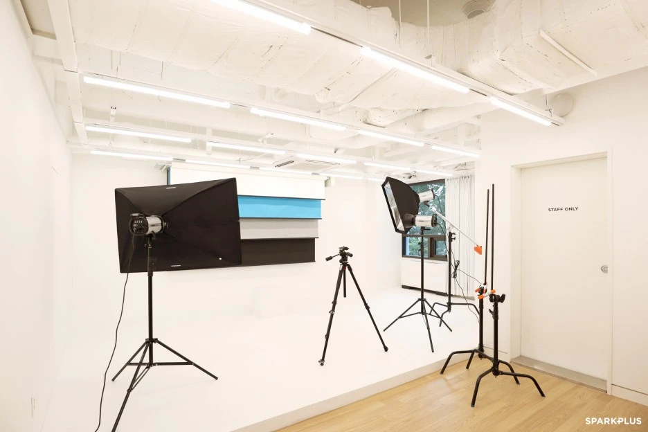 스파크플러스 성수2호점 지하 1층에는 강북지점 중 최초로 '촬영 스튜디오'가 마련되어 있어서, 촬영에 필요한 장비와 액세서리 등 촬영에 필요한 기본적인 장비가 있어 콘텐츠 제작이 가능합니다.