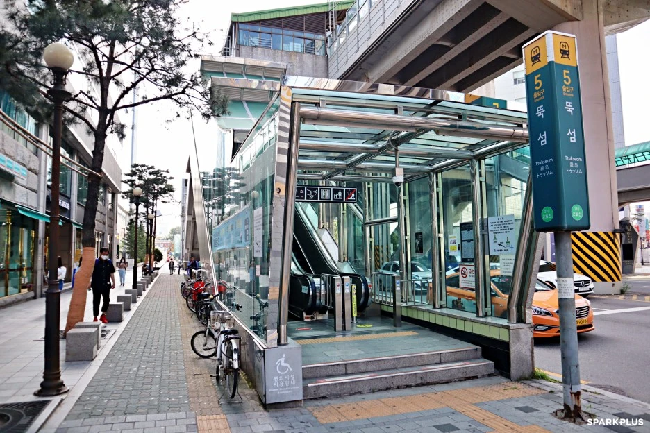 뚝섬역 5번 출구에서 건물 입구까지 1분도 채 걸리지 않는 2호선 초역세권에 위치하고 있습니다. 바로 위 사진처럼 5번 출구에서 창문으로 보이는 건물이 바로 스파크플러스 성수2호점 건물입니다.