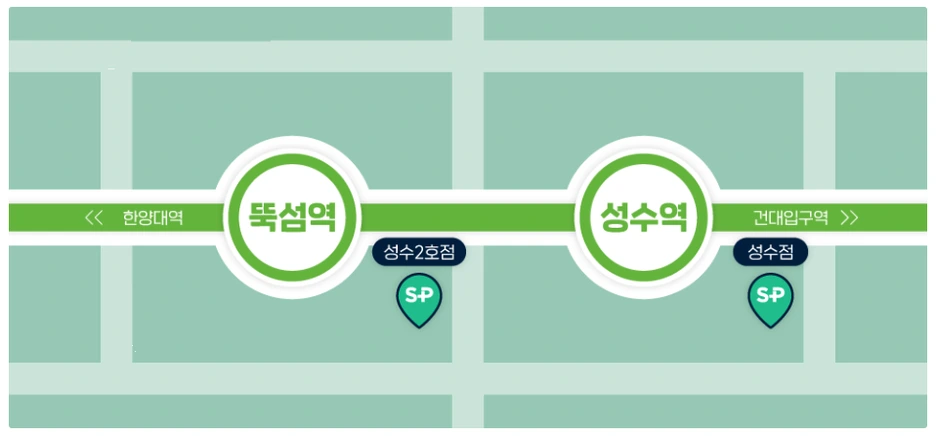 성수동 인근 성수점, 성수2호점이 있어서 유연한 근무가 가능합니다. 두 지점 간 1km 밖에 떨어져 있지 않기 때문에 도보 10분에서 15분이면 이동할 수 있습니다.
