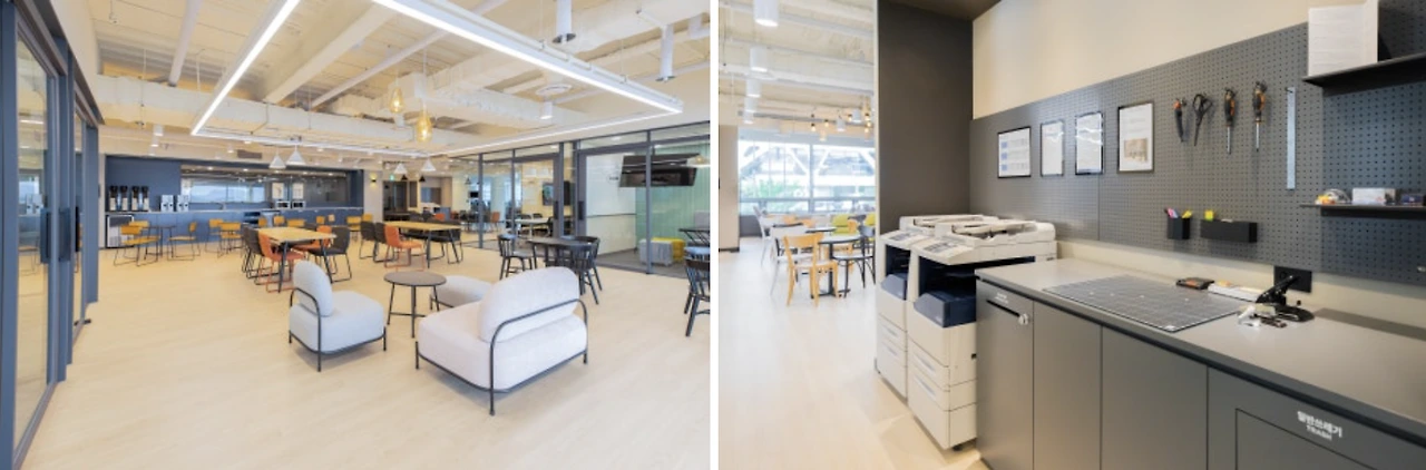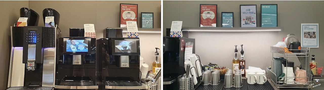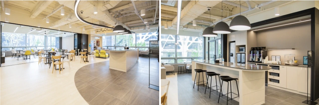 라운지 한편에는 멤버들이 가장 많이 찾는 공간, 카페테리아가 있습니다. 입맛에 따라 원두를 선택할 수 있는 커피머신, 다양한 종류의 티백, 시럽, 얼음 등이 준비되어 있어 취향에 맞는 음료를 만들 수 있습니다.