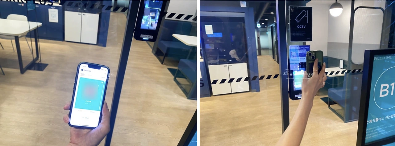 스파크플러스 신논현점 도착 후 오피스플러스 앱에서 발급되는 QR코드를 리더기에 태그하면 라운지로 입장할 수 있습니다. 신논현점은 B2, B1, 2F 총 세 개의 층을 이용합니다. 각 층에는 라운지와 카페테리아, 미팅룸, 오피스 공간이 조화롭게 조성되어 있습니다.