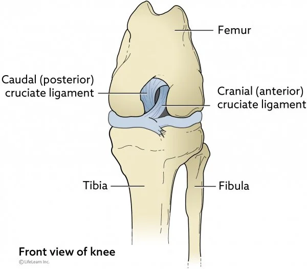 Humans have a similar anatomical structure to the dog knee, but the ligaments are called the anterior and posterior cruciate ligaments. Anterior cruciate ligament rupture is a common knee injury of athletes.