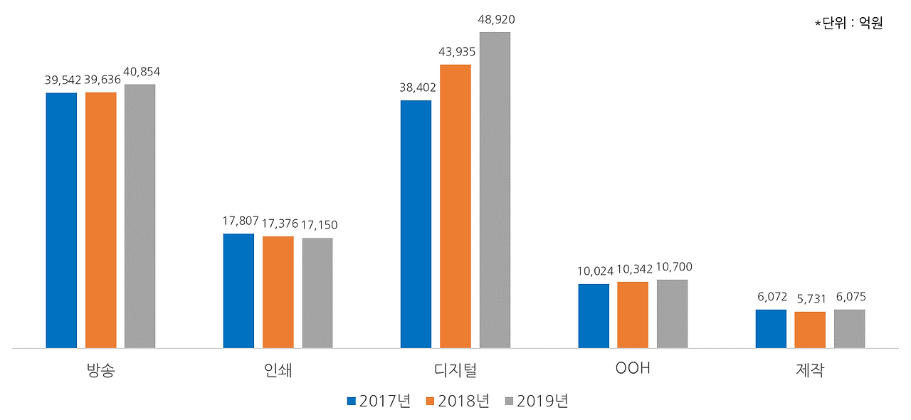: 지속적으로 감소할 것으로 예상되며, 특히 잡지 시장의 경우 주요 매체의 폐간으로 인한 17년 대비 18년 -10.3%를 기록하며 큰 폭으로 하락