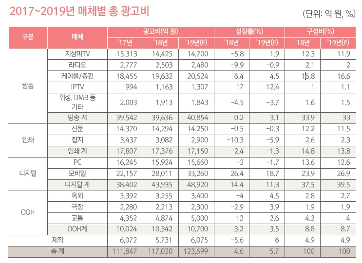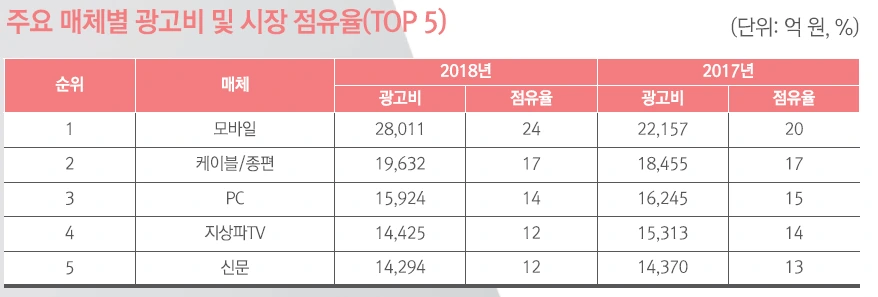 특히 모바일의 경우 17년 대비 18년 광고비 점유율이 20% -> 24%로 증가되었다.