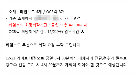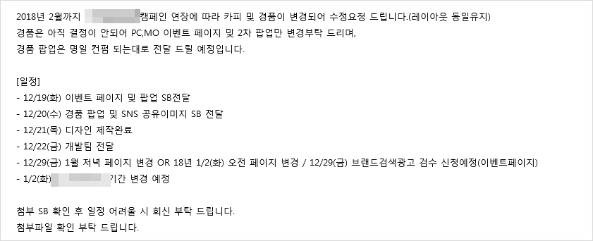 항상 메일은 공손하게 그리고 명확하게 보내야 한다. 그리고 매체 검수 시간 및 광고주 컨펌(확인) 시간을 고려하여 요청한다. 일정이 어렵다면 회신을 요청한다. 이는 빠른 손작업을 요구한다.