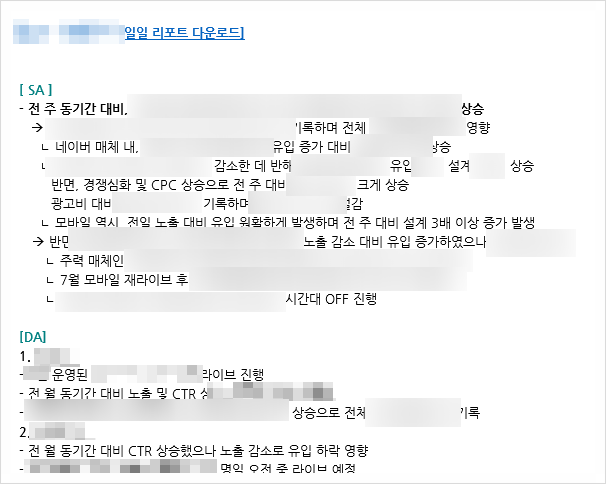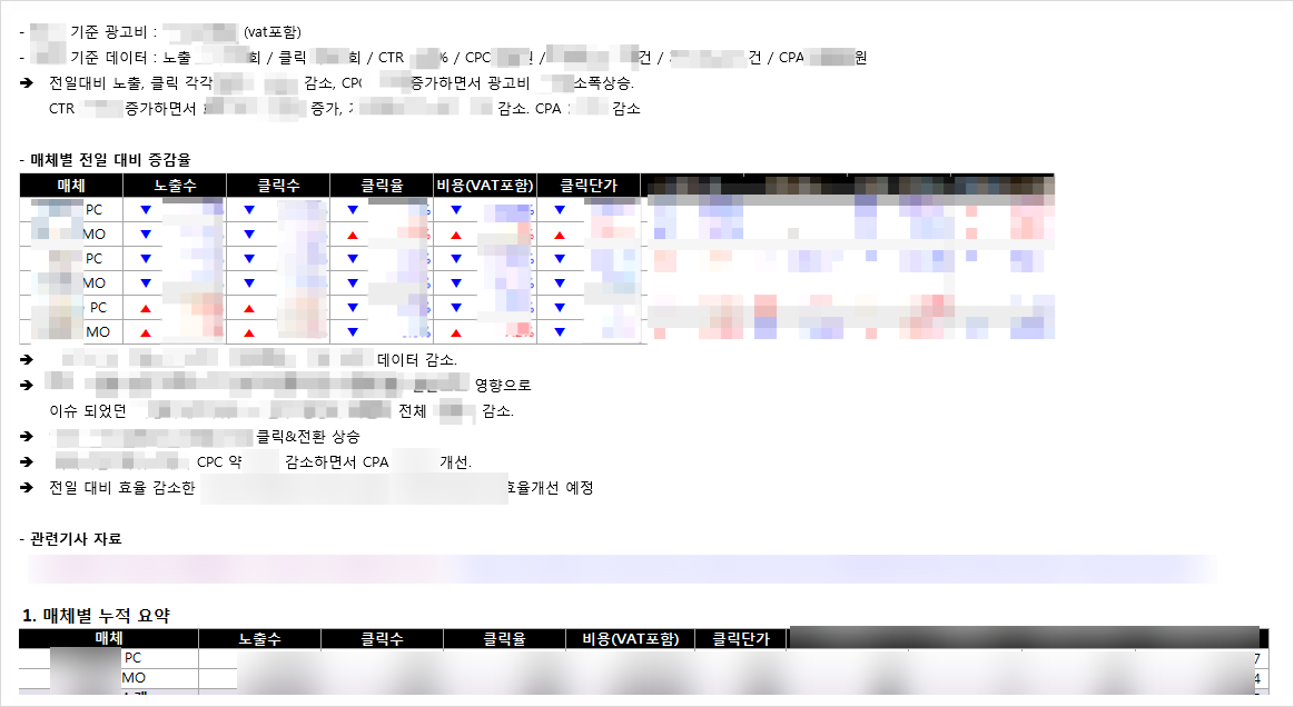 (광고주 실무 담당자 입장에서는 엄청난 데이터를 혼자 일일이 체크하여 보기 어렵기 때문에 간략하게 요점만 정리하여 보내는 경우도 있다)