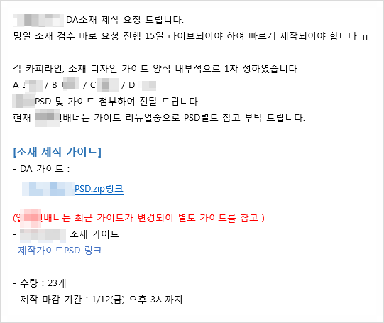 디자이너에게 배너 제작을 요청할 때 주로 PPT로 구성안을 작성하여 보내게 된다. 회사마다 양식은 별도로 있을 것이다. 이때 매체사의 가이드에서 사이즈, 용량, 폰트, 자간, 위치, 등을 확인 > 디자이너에게 가이드 PSD, 일러스트 파일을 함께 전달하여 요청한다. 디자인 팀장 혹은 실무 디자이너와 일정을 조율하고, 사이즈, 수량(종), 카피, 제작 희망 일정(시간까지) 기본적으로 작성, SB에 상세 가이드 혹은 요청사항 등을 작성하여 전달한다.