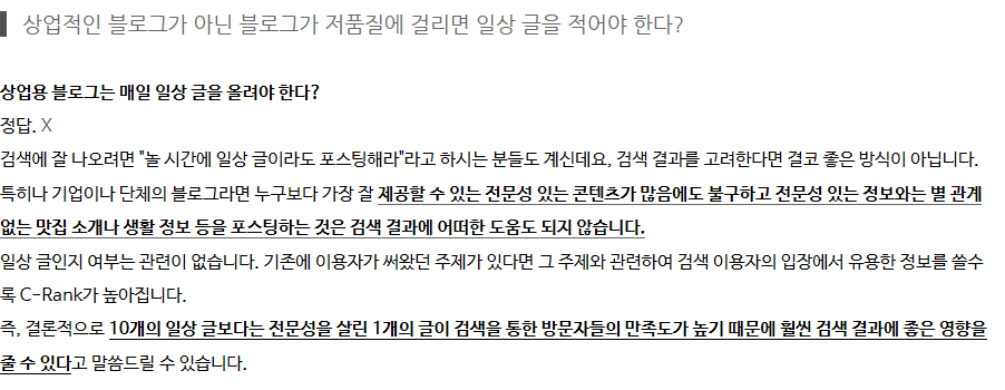 필자가 생각하는 대표적인 거짓말이다. 블로그 로직은 네이버 로직 담당하는 직원이 아닌 이상 모른다. 그리고 그것은 굉장히 큰 보안사항이다. 네이버 블로그는 C랭크 로직과 더불어 공개하지 않은 다양한 필터링 시스템과 랭킹 모델 시스템이 적용되어 있다. 일 1만 명 이상이 방문하는 파워 블로그의 경우 워낙에 유입량 자체가 많기도 하고, 여러 이웃들의 공감과 댓글 반응 지원도 있다. 또한 일단 그 정도 유지하는 블로거들의 글의 퀄리티 자체가 높기 때문에 노출에 유리해지는 경우도 많다. 의미 없는 사진과 글로 블로그를 도배하기보다 퀄리티 있는 파워블로거에게 의뢰해서 제품 포스팅을 의뢰하는 것이 나을 수도 있다.
