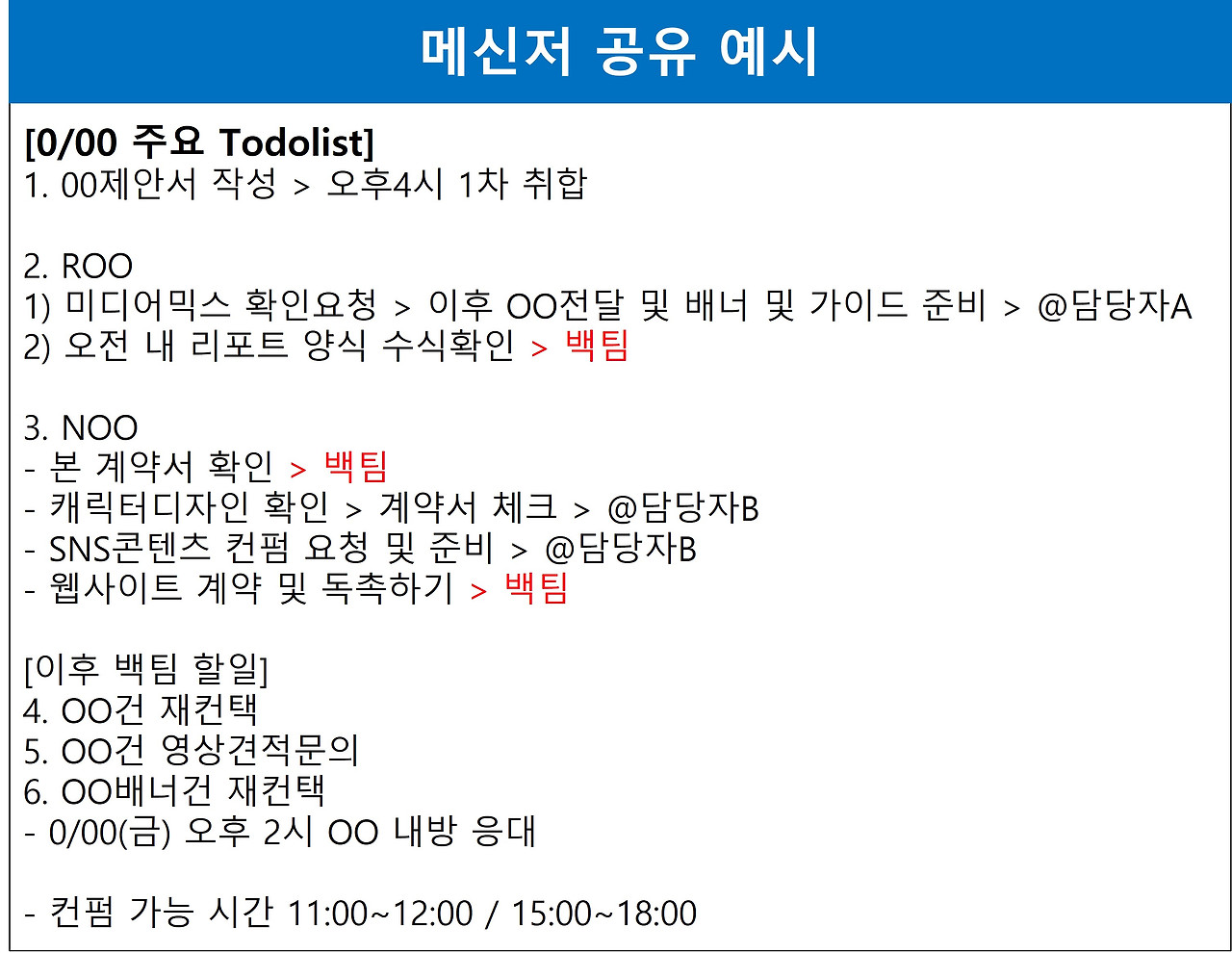 놀고먹는 상사와 팀장이 없다는 건 부정하지 않겠지만, 팀장과 상사가 흔히 놀고 있다고 생각에 빠지기 쉽다. 정말 노는 사람은 누구나 알게 된다. 아이러니하게도 '월급루팡' 개인에게는 좋다고 볼 수 있다. 팀장이 팀원이 무슨 일을 하는지 알아야 하듯이, 팀원도 팀장이 무슨 일을 하는지 알아야 한다. 정기적 공유란이 있어서 누구나 쉽게 확인하면 좋겠지만, 어렵다면 팀원들에게 메신저로 하루에 한 번이든, 일주일에 한 번이든 공유해라. 그리고 미팅을 가거나, 회의하는 일정을 공유해라. 더 어렵다면 구두로라도 오늘 어떤 일을 하는지, 어떤 일정이 있는지 알려주어라. 모든 업무를 자세하게 밝히기보다, 가독성 좋게 팀장이 오늘 무슨 업무를 진행하고 체크해야 할지 그리고 팀원들에게 요구할지 To Do List를 만드는 것도 좋은 방법이다.