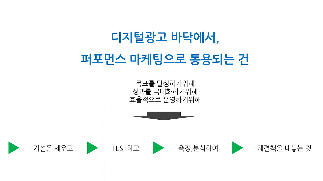 성과를 낸다는 측면과 디지털 마케팅 영역에서 보자면, 목표를 달성하기 위해, 성과를 극대화하기 위해, 효율적으로 운영하기 위해, 가설을 세우고 TEST 하고 측정, 분석하여 해결책을 내놓는 것으로 말할 수 도 있을 것이다.