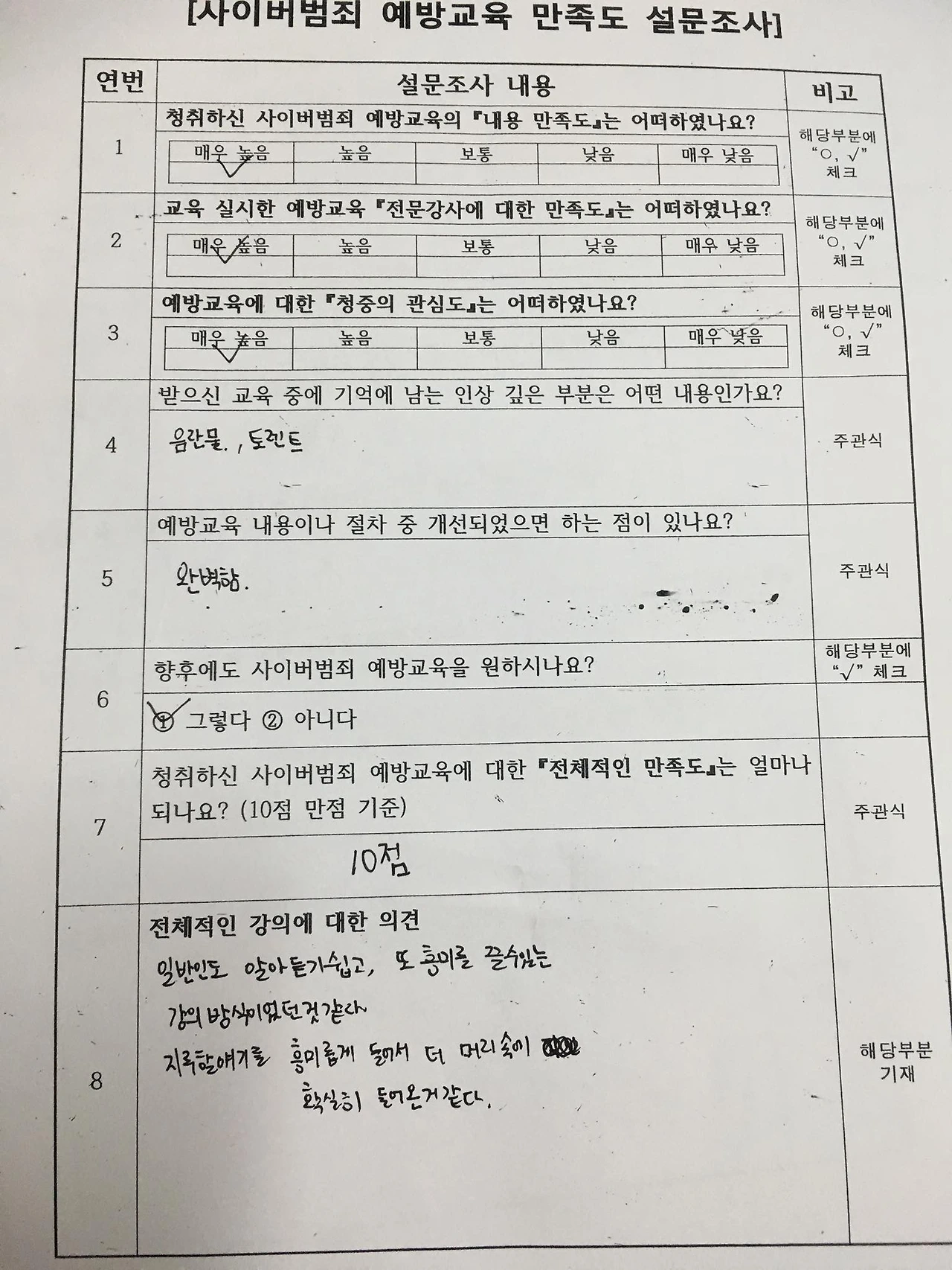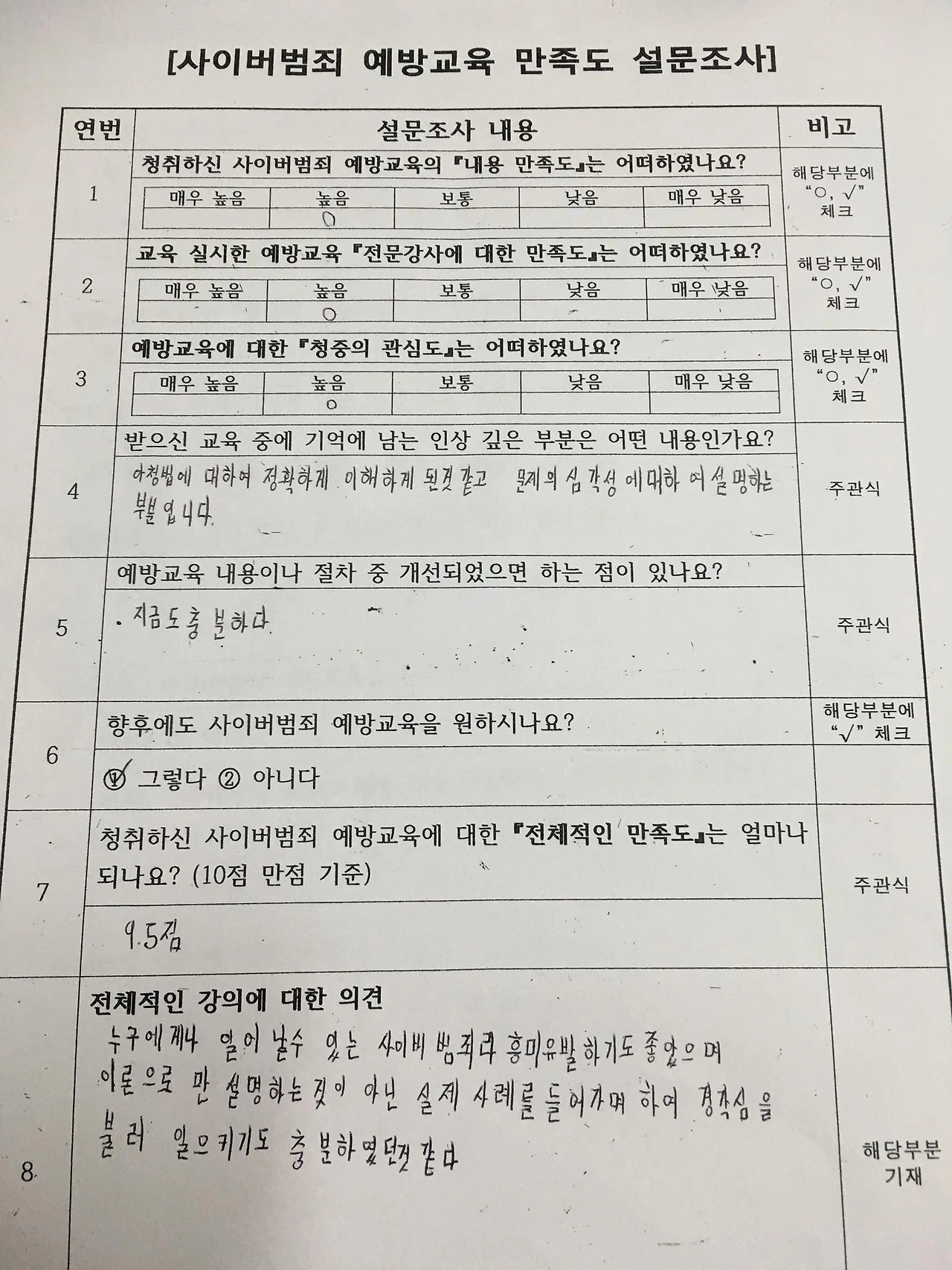 저에게 검거된 번개장터 피의자 학생이 퇴학 전 다녔던 학교라 선생님들도 사이버범죄 예방교육이 필요하다는 부분에 공감해 주셨습니다.