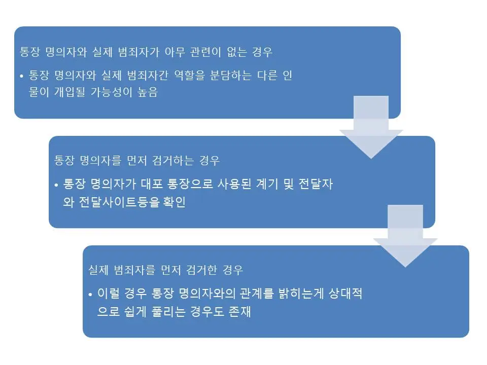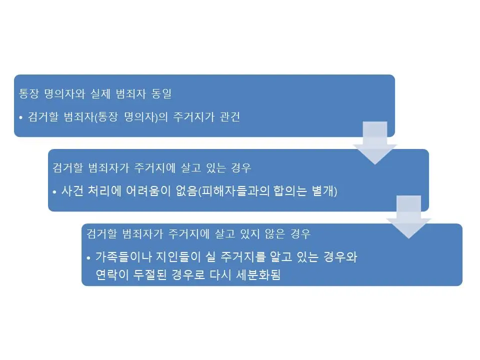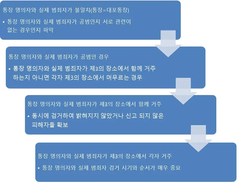 2번의 경우처럼 통장 명의자와 실제 검거를 해야 할 범죄자가 다른 경우는 누구를 먼저 검거해야 하는지 시기를 정하는 게 굉장히 중요하고 여기서 통장 명의자든 실제 사기를 저지른 범죄자든 동시에 검거되지 않고 한 명이 먼저 검거되면 그 정보가 흘러 들어가 또다시 숨어 들어갈 가능성이 높아지기 때문입니다.