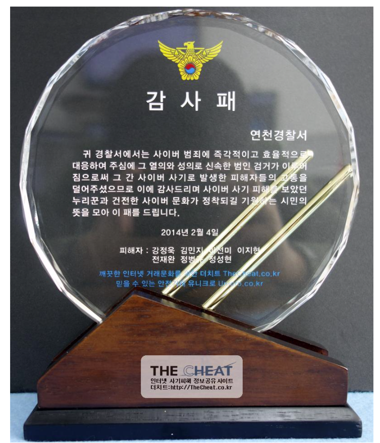 큰 사건 하나 마무리하고 나니 추가 피해자를 찾기 위해 도움을 받았던 더치트(the cheat) 측에서 저에게 소중한 감사패를 보내 주셨습니다.