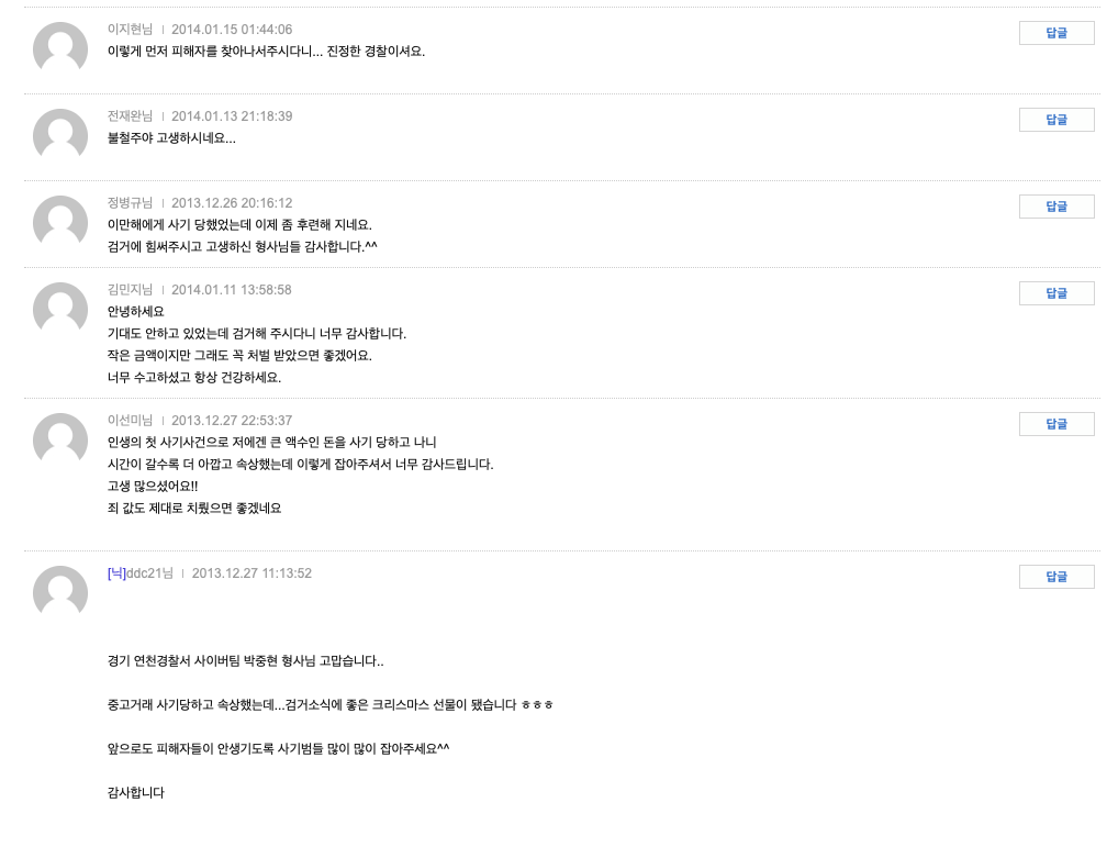 그때 팀원이 한 명이라도 더 있었더라면 업무를 나눠서 하고 피해자들과 다른 분들에게 사이버범죄 중 오늘까지 많은 부분을 차지하는 직거래 사기 사건의 유의점과 배상명령 청구 과정을 알려 줬을 건데 그 당시는 피의자 검거하고 보고하는 게 제 업무의 전부라고 생각하고 있었습니다. 그러니 사이버범죄 예방이라는 부분까지 신경 쓸 여유는 전혀 없었고 굳이 내가 나서서 해야 할 일은 아니라고 생각했습니다.