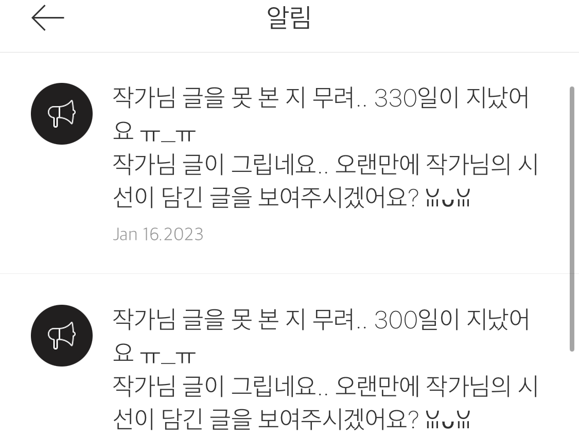 그렇게 오랜만에 브런치를 열어봤더니 세상 귀여운 알람들이 나를 기다리고 있었다. 내가 글을 쓰지 않은지 벌써 330일이 넘었다니. 330일이면 거의 1년 아닌가? 알람을 보자마자 같이 책 읽고 있던 남편에게 '나 갑자기 글을 써야겠어.'라고 선포한 뒤 맥북을 꺼내 열었다.