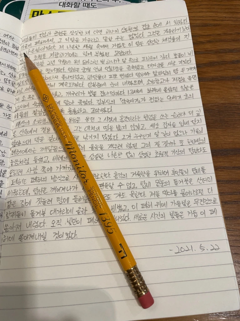 일단 당장의 목표는 김훈 작가의 <자전거 여행> 1권 전체를 베껴써 보는 것이다. 김훈 작가의 글은 어려운 어휘나 형이상학적 표현이 거의 없이, 일상적 어휘와 단문 위주의 문장만으로 쉽게 읽히면서도 아름다운 문장을 구사한다고 생각하기에 그의 문장을 배우고 싶다. 그도 원고지에 연필로 글 쓰는 방식을 지금까지 고수한다고 한다. 그래서 오른팔의 통증이 느껴질 때마다 묘한 동질감을 떠올리며 혼자 피식 웃기도 한다.