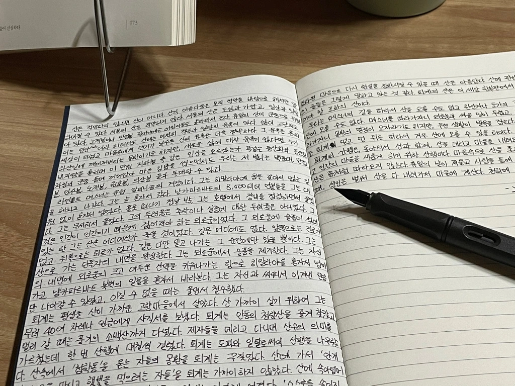 하지만 흑연을 마모시켜 글씨를 쓰는 연필의 특성상 손목에 힘을 많이 줘야 하니, A5 사이즈의 노트 서너 페이지 정도를 쓰고 나면 손가락, 손목, 어깨가 동시에 비명을 질러댔다. 손가락과 손목의 통증이라도 줄여보기 위해 연필꽂이에서 한동안 먼지만 뒤집어쓰고 있던 만년필을 꺼내들었다. 4~5년쯤 전에 김승옥 작가의 단편소설들을 필사하려고 샀다가 시들해져서 연필꽂이에 꽂아놨던 것이다. 만년필을 사용하고 나니 손가락과 손목에 힘을 덜 주게 되어 확실히 통증은 다소나마 줄어들었다.