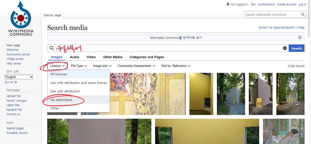 위키미디어 커먼즈에서 검색어 입력 후 옵션으로 라이선스 제한 없음을 선택하여 검색할 수 있다.