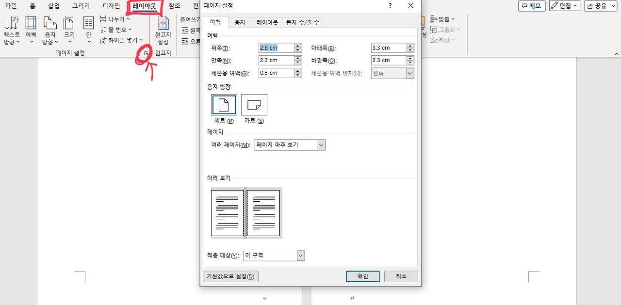 풀다운 메뉴에서 <레이아웃> 아래 아이콘에서 <여백>을 클릭해도 되고, 그림에 빨간색 화살표로 표시한 곳을 클릭하면 위와 같은 창이 뜬다.