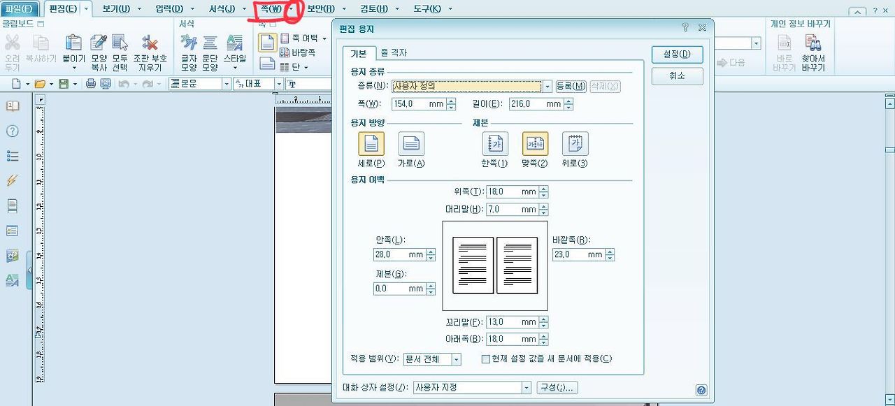 풀다운 메뉴(상단메뉴)에서 <쪽> - <편집용지>를 선택하면 위 그림의 창이 뜬다.