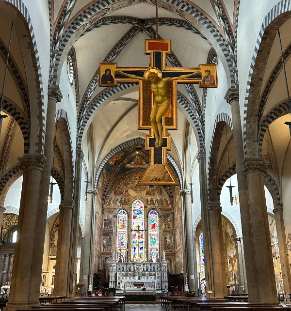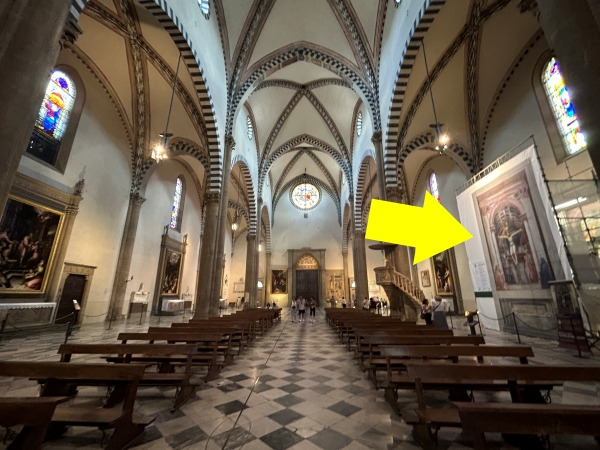 산타 마리아 노벨라 성당에 들어서면 십자가가 중앙 통로에 걸려있어 의아했는데요.